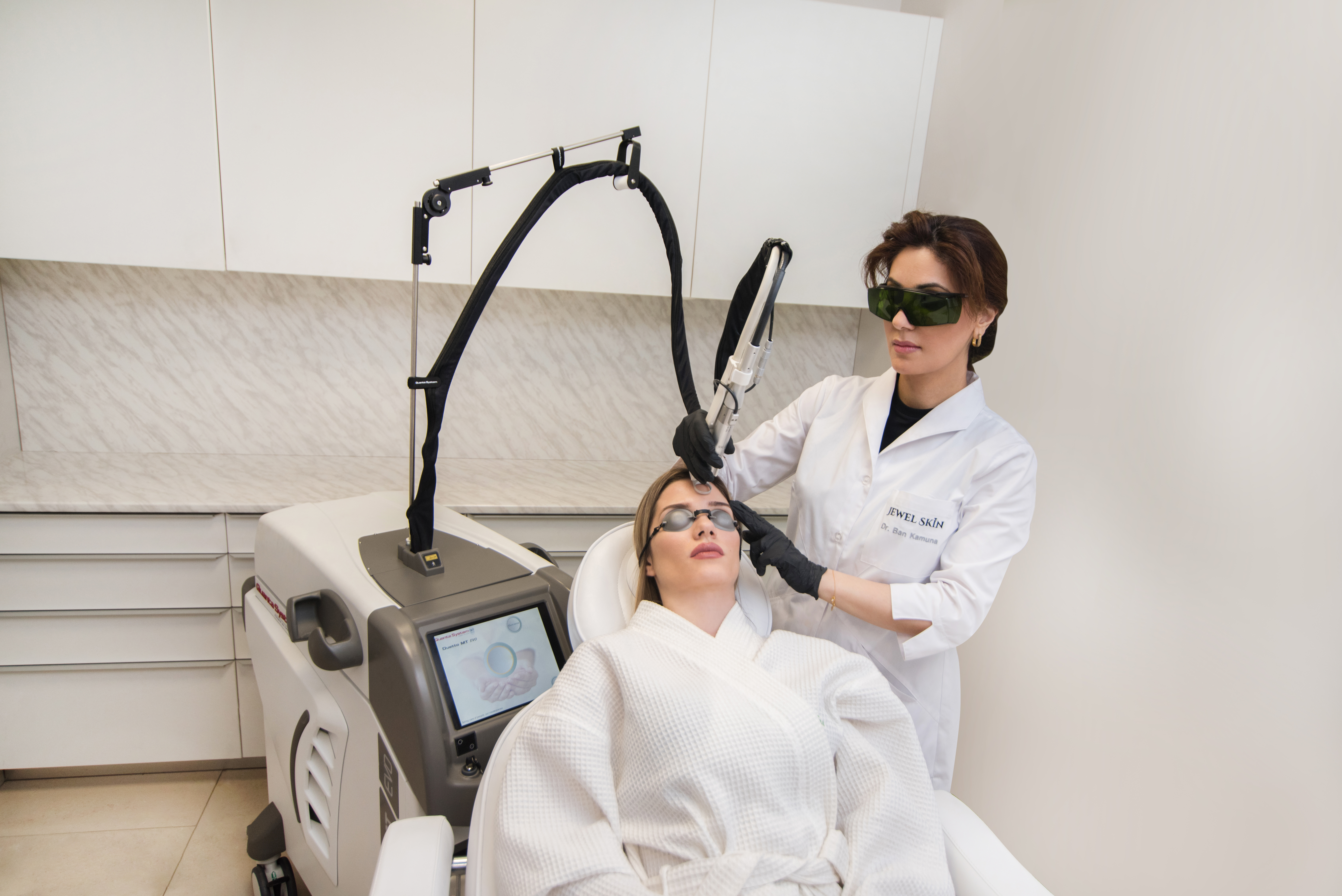 „В Jewel Skin Clinic предлагаме лазерната система Duetto MT - EVO, базирана на Александрит 755 nm и Nd:YAG 1064 nm лазерни вълни. В зависимост от цвета на кожата имаме възможност да използваме синергичният ефект на двата лазера или всяка лазерна система поотделно. В рамките на шест до осем сесии, разпределени в 4 до 6 седмици, броят на космите ще намалее от 70 до 80%. За най-добри резултати се препоръчва поддържаща терапия, извършвана веднъж годишно в продължение на поне две години“, заявява д-р Бан Камуна.